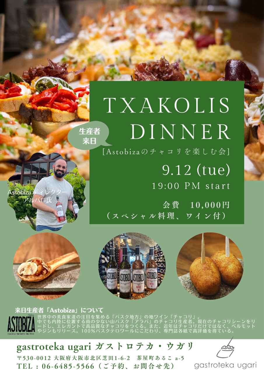 スペインバスク・チャコリのワイナリー、アストビサの生産者を迎え、いろんな種類のチャコリや、ジン、ベルモットを加えたラインナップにウガリのお料理を合わせて提供いたします。